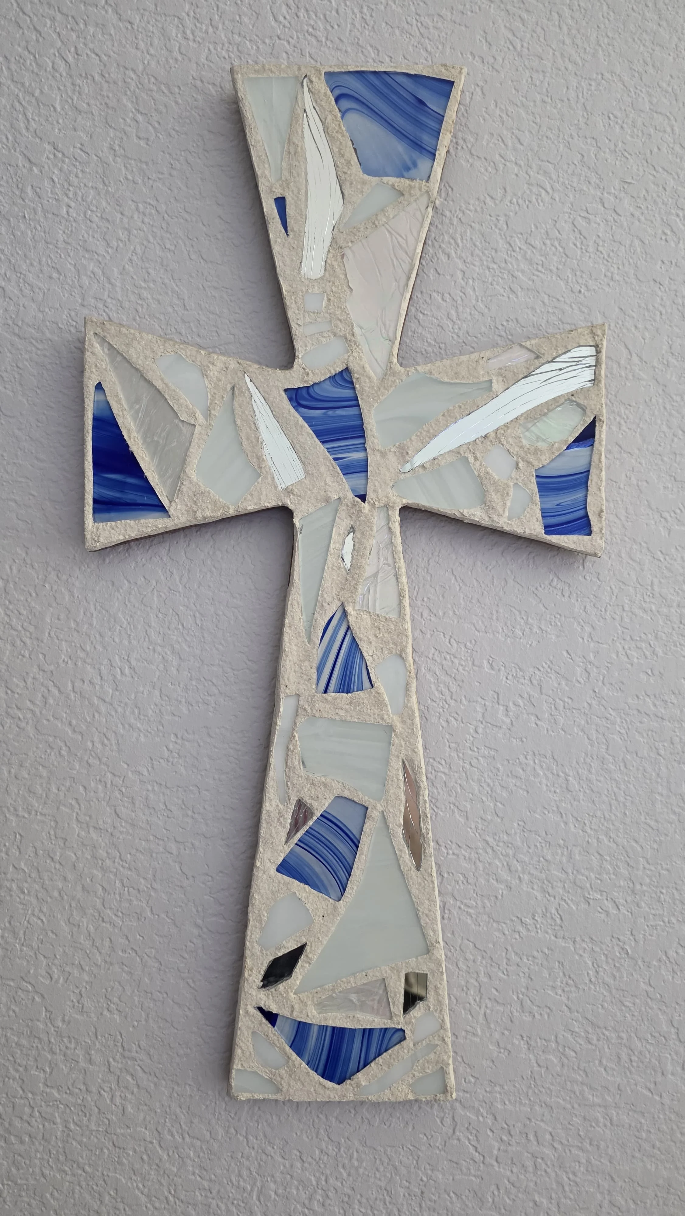 Cobalt, azure, and mirrored glass reflect the Mediterranean's brilliant blues and coastal beauty. Inspired by Santorini's Three Bells church, this cross will bring light and life to any room. Custom engraving available.